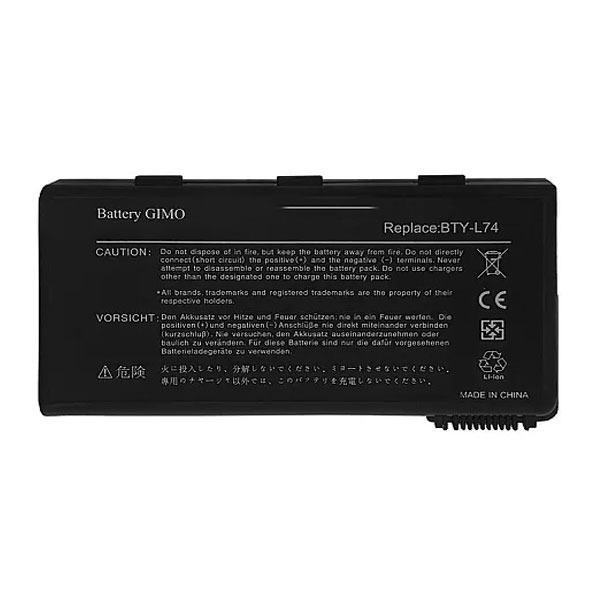 باطری Msi L74 به صورت 6 سلول Gimo تولید شده که دارای 6 ماه گارانتی تعویض میباشد شرکت افق برای رضایت مشتریان علاوه برگارانتی،7 روز مهلت تست کالا را نیز برای مشتریان فراهم نموده است. برای راحتی در تشخیص مدل باتری L74 می توانید از پارت BTY L74 روی باتری که از ترکیب عدد و حروف تشکیل شده است کمک بگیرید ، پارت نامبر باطری ام اس آی L74 به صورت BTY L74 می باشد یکی از مواردی که باید به آن توجه کنید میباشد این است که بهتر است باطری لپ تاپ شما حداقل هفته ای یکبار شارژ کامل و خالی شود